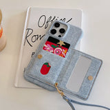 【Premium Material】 Crafted from high-quality jeans cloth texture PU leather, PET, and microfiber lining, this handset cover offers a plush and ergonomic feel while providing long-lasting protection for your device 【Zipper Design with Ample Storage】 Features a zipper card holder design with multiple storage options, including 2 card slots and 1 finger hole for effortless access to your cards and IDs 【Integrated Folding stand Function】 The card holder doubles as a kickstand, allowing you to prop your handset up for hands-free viewing, ideal for watching videos or video calls 【Built-in Mini Makeup Mirror】 Includes a convenient mini makeup mirror inside the case, adding an extra layer of functionality for on-the-go touch-ups 【Camera Protection】 Equipped with a raised lip around the camera area, offering added protection against scratches and damage to your device's lens 【Convenient Wrist Strap】 Comes with a elegant faux-leather wrist strap, making it effortless to carry your handset securely while providing added comfort and convenience for everyday use